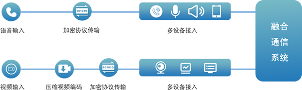 电话、视频、数据网络等多网合一。通过加密协议传输语音,实现模拟电话、对讲设备、扩音设备、移动终端接入融合通信系统。通过多种格式压缩视频编码,通过加密协议打包传输,实现摄像头、监控平台、DVR等设备接入融合通信系统。